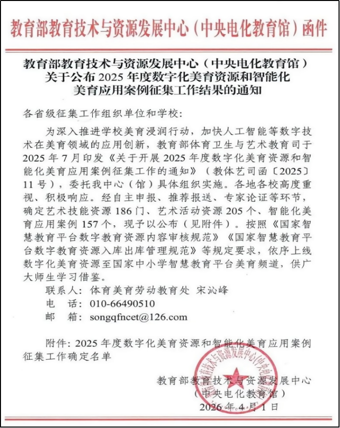 近日,教育部教育技术与资源发展中心(中央电化教育馆)公布2025年度数字化美育资源和智能化美育应用案例征集工作结果,我院孙丝丝教授团队的《“智鉴经典·育见未来”——学科AI引擎驱动下可视化与多智能体协同的音乐美育实践》、侯侠老师团队的《从想象到呈现:<舞蹈演出效果虚拟仿真实验>智能化美育应用案例》入选智能化美育应用案例。