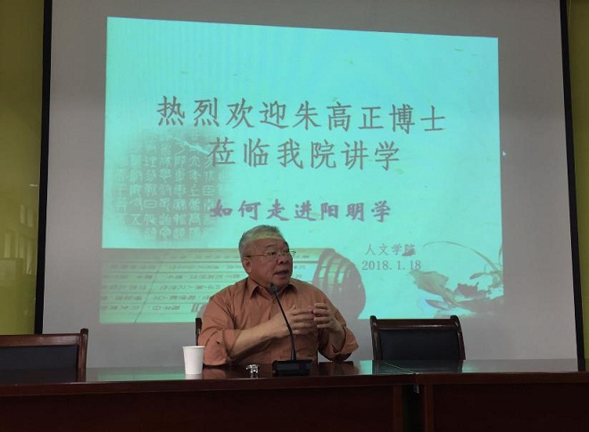1月18日上午9时,来自台湾地区的著名学者、南宋大儒朱熹的第26代嫡孙朱高正博士应邀在田家炳楼209会议室为98堂 师生献上了一场“如何走进阳明学”的文化盛宴。朱高正先生从自身求学经历入手,强调学习与生活体验、亲身体悟相结合。首先,分析王学(王阳明)与朱学(朱熹)之间的承续关系,指出阳明学是在朱子学土壤中发展起来的。其次,分析王阳明的经典哲学著作《传习录》的思想形成过程,详细分析和阐释了“知行合一”、“...
