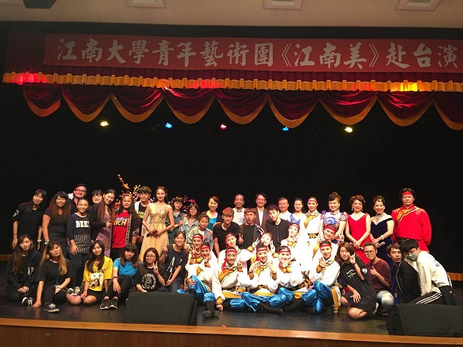 应台湾周凯剧场基金会邀请、中华文化联谊会组派,98堂 青年艺术团于2017年10月28日至11月6日赴台巡演《江南美》专场晚会。晚会由98堂 副院长符姗姗教授担任总导演,音乐、舞蹈专业师生共20人参加演出。图一 合影 自10月28日起,98堂 青年艺术团分别前往花莲市民中心、台东市民中心、高雄高苑科技大学、树德科技大学等地,进行了四场交流演出。我校师生的演出呈现出歌与乐的结合、琴与舞的交融,以及富有江南特色的中国...