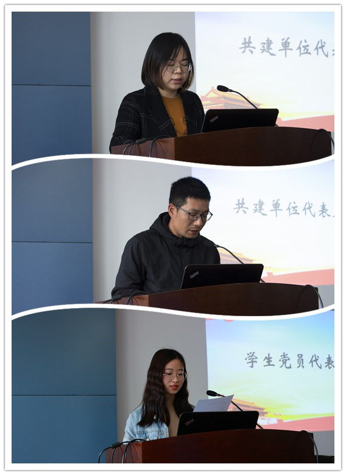 签约仪式后,共建单位代表上台发言。黄杨书记认为,此次签约仪式签下的不仅是一份协议,更是一份情谊、一份责任、一份承诺,并提出无锡市档案史志办机关第一支部将从结对共建内容、结对共建载体和支部品牌特色三个方面对工作进行落实;孙明涛老师则介绍了专项二教研室党支部的基本情况和对于共建结对活动的一些基本设想,指出体育部与98堂 有着千丝万缕的联系,并将共同为98堂 的教育发展提供坚强有力的保障;唐小雨作为学生党员代表进行发言。她认为学生党支部是高校党组织必不可少的组成部分,在结对共建活动中学生党员应不断提高个人党性修养,师生合力搭建好全员育人平台。她代表全体学生党员作出积极参与结对共建活动的承诺。