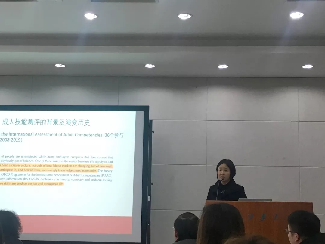 交流会伊始,主持人致辞,对刘博士及与会嘉宾的到来表示了热烈欢迎。随后,刘华聪博士以“什么是文盲”作开篇发问,通过纺织工人和高新技术人才的图片对比,阐释了当代“功能性文盲”的定义,进而对成人技能测评进行诠释。此外,刘华聪博士向师生们介绍了PIAAC对三类基本技能的定义,PIAAC的基本概况以及该评估体系对成人阅读、数理能力测试的基本操作情况,向全院师生们展示了世界不同国家在该项测试中的研究结果。进而,刘博士着重强调了社交情感能力的重要性。她就研究中的两个问题,提出PIAAC数据库中的社交情感能力,并以2005—2017年以色列、德国、美国三个国家的产业结构变化为例,分析了社交情感因素在弥补认知能力方面发挥的重要作用。最后,刘博士就98堂