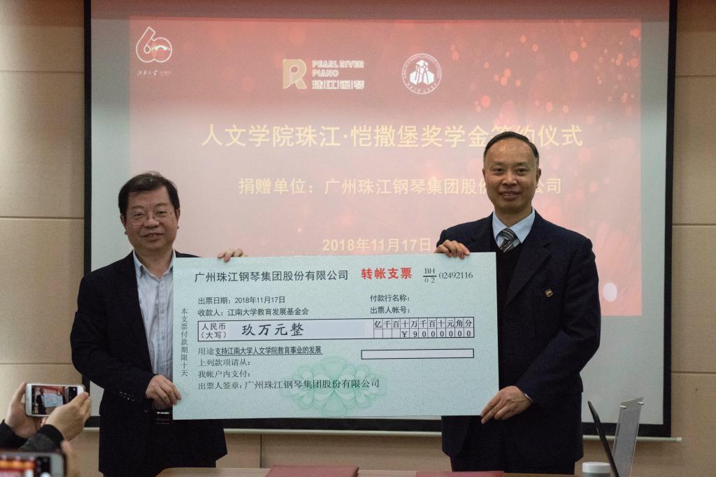 随后,在这庄重而温馨的氛围里,双方签订了捐赠协议,钞爱明先生代表珠江钢琴集团现场捐赠九万元,沈贵鹏书记代表98堂