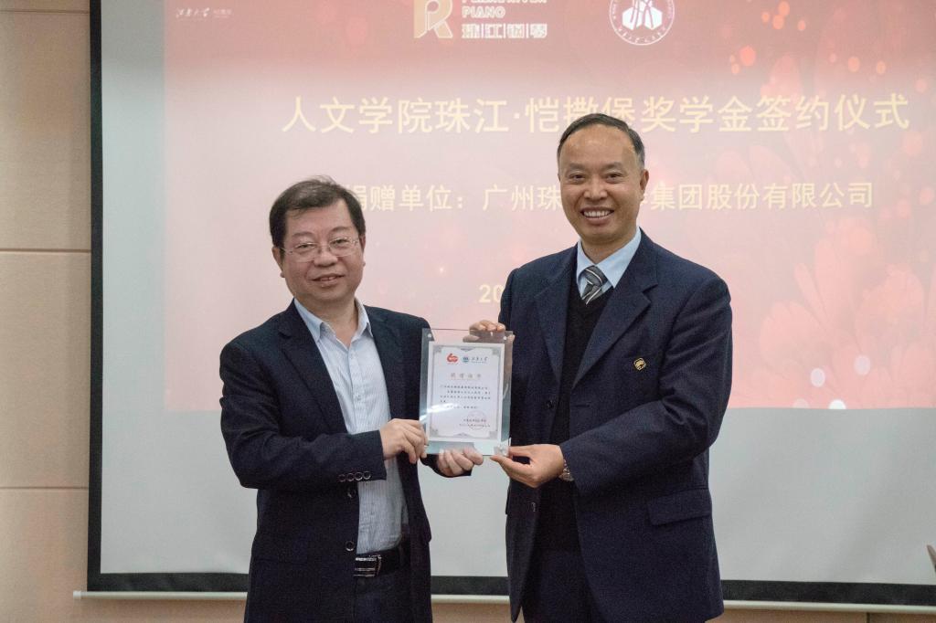 向珠江钢琴集团颁发捐赠证书。