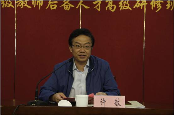 为本次培训提供的便利,并承诺将按培训要求努力学习。最后无锡市教育局副局长许敏代表无锡市教育局发言,他回顾了近年来无锡市高端教师培训的培养历程,希望研修班学员要立足于讲台、潜心于教学、专注于修炼,做“有理想信念、有道德情操、有扎实学识、有仁爱之心”的好老师,担当起教育使命,在课堂上充分展示自己的师德、师能,做思想和知识的传播者,做团队的引领者,争取早日成为真正意义上的特级教师。